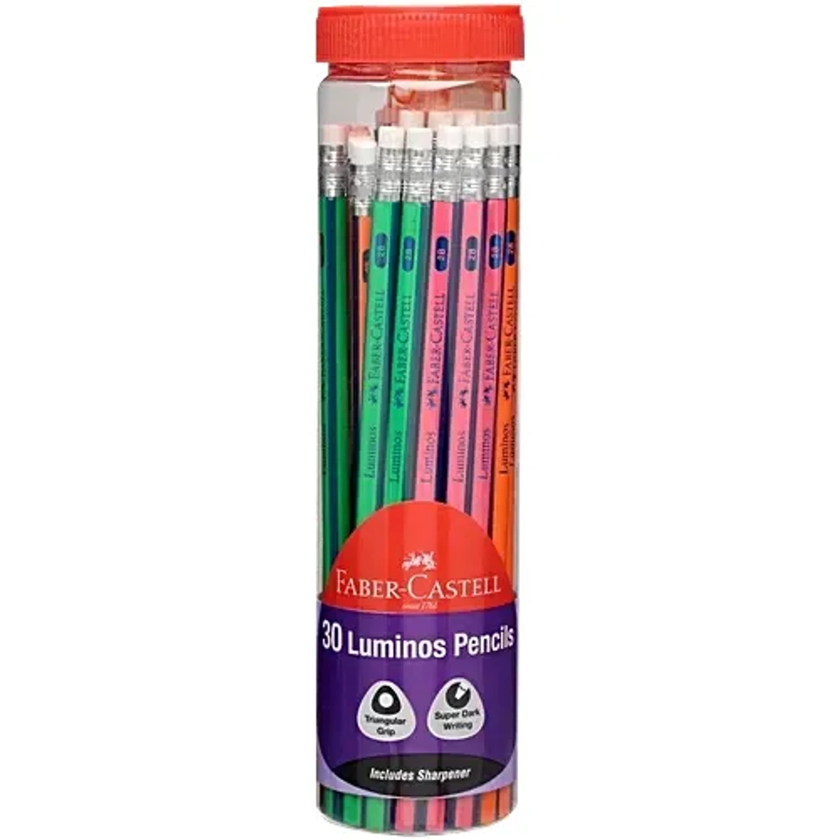 Faber-Castell Graphite Pencils feature a triangular shape for an easy, comfortable grip, making them perfect for both beginners and professionals. Crafted from high-quality wood, these pencils deliver smooth and super dark writing for precise and clear lines. Available in fun fluorescent colours, they add a vibrant touch to your writing and drawing tools. The set comes in a convenient jar design, containing 30 multi-colour pencils, making storage and access simple. Plus, each set includes a sharpener, ensuring your pencils are always ready for use. Ideal for school, office, or creative projects, these pencils combine functionality and fun in one package.