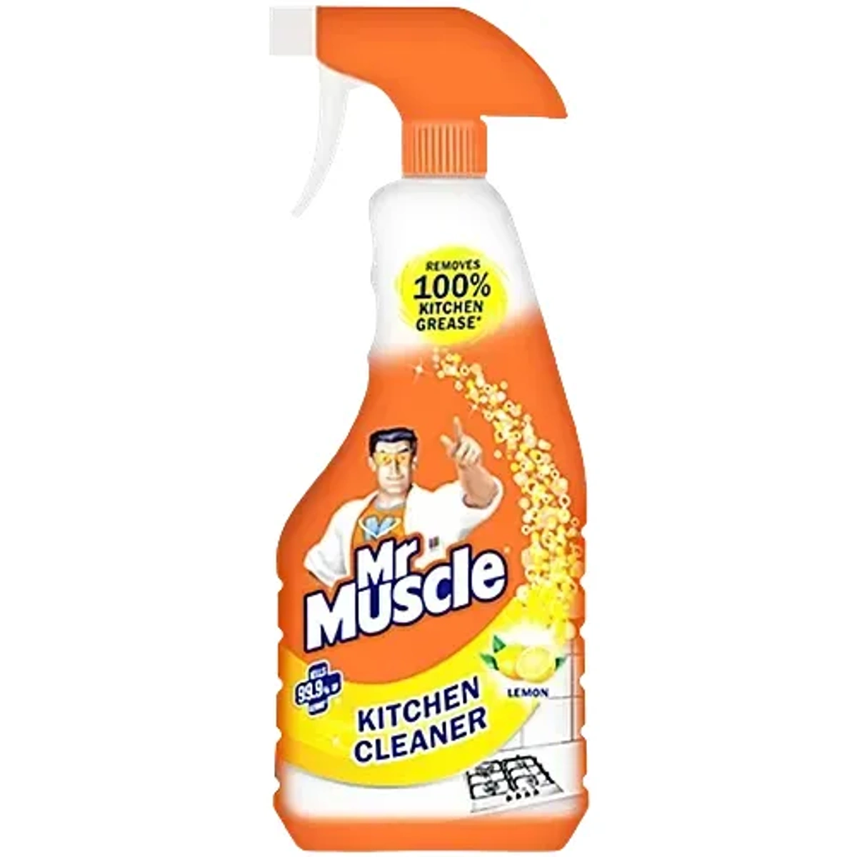 Kitchen cleaning will never be a hassle ever again, thanks to Mr. Muscle Kitchen Cleaner! This kitchen cleaning expert is perfect for removing all kinds of kitchen stains on all kinds of surfaces effortlessly. It is 10x better* vs dishwash bar and liquid soap, making kitchen cleaning convenient and time-saving. This kitchen cleaner works on the toughest of stains like oil stains, grease, oil, burnt milk, haldi (turmeric), curry, masala, dried milk, tea, coffee, rice water stains and many more. Mr Muscle Kitchen Cleaner spray removes 100% Kitchen grease* from surfaces including the stove, chimney, exhaust, countertops, tiles, refrigerator, and microwave. Its unique trigger design prevents spillage and wastage, saving you time and effort. The kitchen cleaner for grease removal also kills up to 99.9% germs^, making your kitchen not just shiny clean, but also germ-free! *as per standard testing protocol; ^when used undiluted