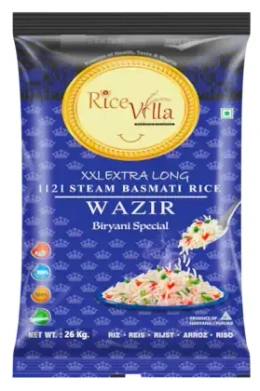 Healthy Rice Villa WAZIR 1121 Steam Basmati Rice (Biryani Basmati) is Long Grain Aromatic Rice Grown for Many Centuries in India. WAZIR 1121 Steam Basmati Rice (Biryani Basmati) is one of The Types of Basmati Rice. It is a Hybrid Extra Long Grain Rice Grown in Haryana and Punjab States of India. Healthy Rice Villa WAZIR 1121 Steam Basmati Rice (Biryani Basmati) is Heat Resistant and Do Not Break or Crack on Cooling. It is a Slim Rice Grain with Extra Long Grain Length of 8.5 mm (XXL). It Extends Up to Thrice if Cooked Properly. Healthy Rice Villa WAZIR 1121 Steam Basmati Rice (Biryani Basmati) is Scented Special Biryani Rice and Sourced Best Grain from the Foothills of Himalayas. Grains Contains < 13 % Moistures and The Grain is Up to 8.5 mm. Healthy Rice Villa WAZIR 1121 Steam Basmati Rice (Biryani Basmati) is good for Biryani and Pulao Dishes.