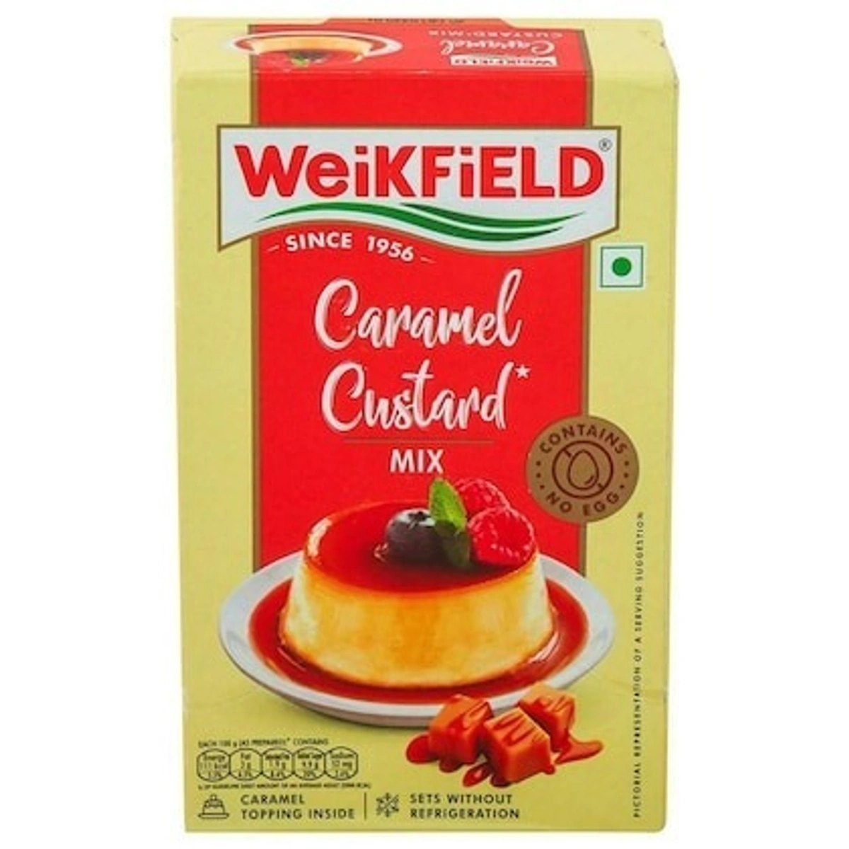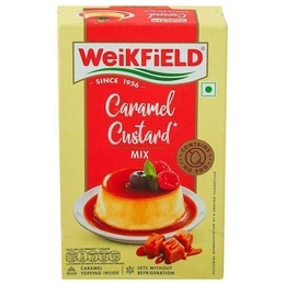 Enjoy delicious caramel custard at home, hassle-free, anytime with Weikfield Caramel Custard Mix, the pack contains Caramel Topping too. All you need to do is boil milk and add the Weikfield Caramel Custard Mix, cook as per the instructions on the carton, and let it set. It sets without refrigeration too. The mix is vegetarian and contains no eggs. So what are you waiting for? Go ahead and buy this product online today!