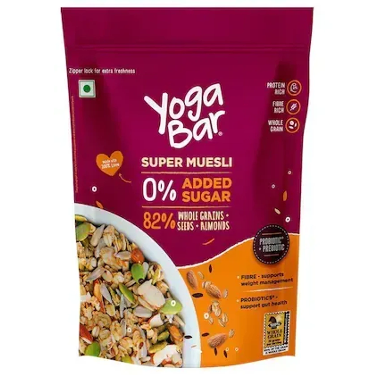 Made from a mix of oats, wheat, barley, rye, sunflower seeds, pumpkin seeds, and almonds, this superfood-rich muesli offers a balanced blend of complex carbohydrates, protein, and fiber. The addition of nuts provides crunchy texture and nutty flavor, while the seeds add an extra boost of omega-3 fatty acids and antioxidants. Perfect for those looking for a quick and easy breakfast or snack option, Yogabar Super Muesli is also ideal for health-conscious individuals seeking a nutritious way to start their day. With its wholesome ingredients and high nutritional value, this muesli blend is an excellent choice for anyone looking to incorporate more whole foods into their diet. It's also suitable for vegetarians and vegans, making it a great option for those following plant-based diets. So what are you waiting for? Go ahead and buy this product online today!